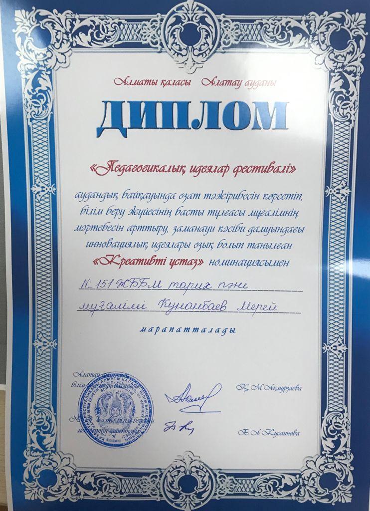 "Педагогикалық идеялар фестивалі" аудандық байқауында озат тәжірбиесін көрсетіп,білім беру жүйесінің басты тұлғасы мұғалімнің мәртебесін арттыру , заманауй кәсіби дамуындағы инновациялық идеялары озық болып танылған "Креативті ұстаз" номинациясымен тарих пәні